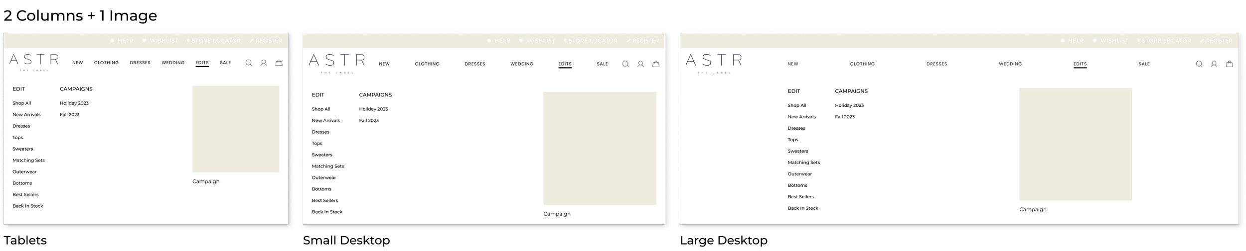 I created different versions of the mega menu where we have the flexibility to include different options such as how many columns do we need or if we can add 1 or 2 images. Ideally all the mega menu will still look very similar and be cohesive to one another.