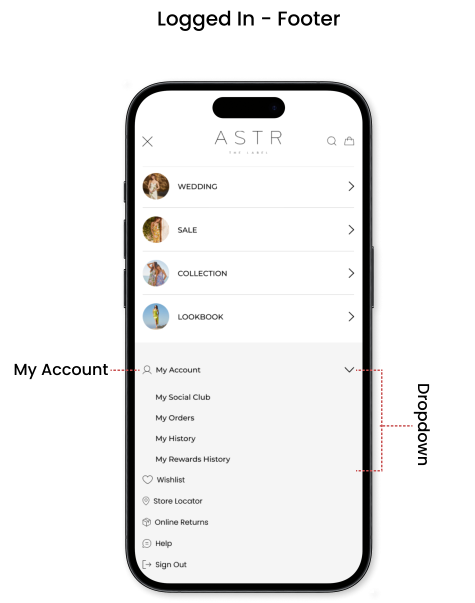 Adding footer on the mega menu will help the users to navigate to sign in, wishlist store locator, online returns, help and sign out. Once the use is logged in they will also have an option to access their account clicking on the dropdown menu.
