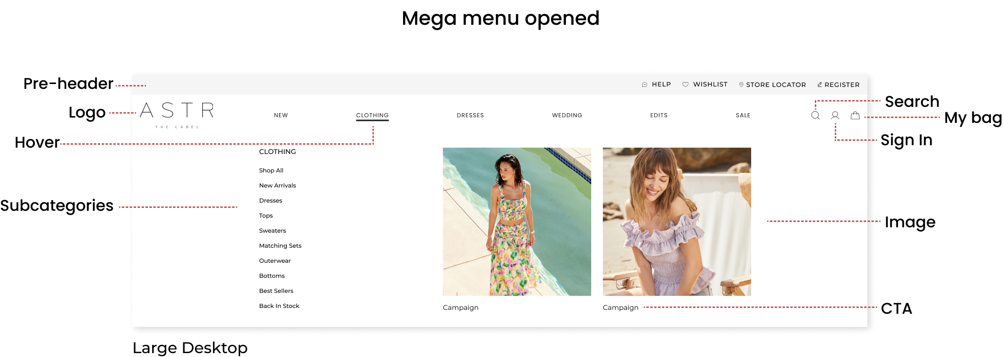 Desktop: Pre-header will be added before the main header where we decided to add links to Help, wishlist, store locator and sign up. Main header will be included the logo main navigation, search icon, sign in icon and bag icon.