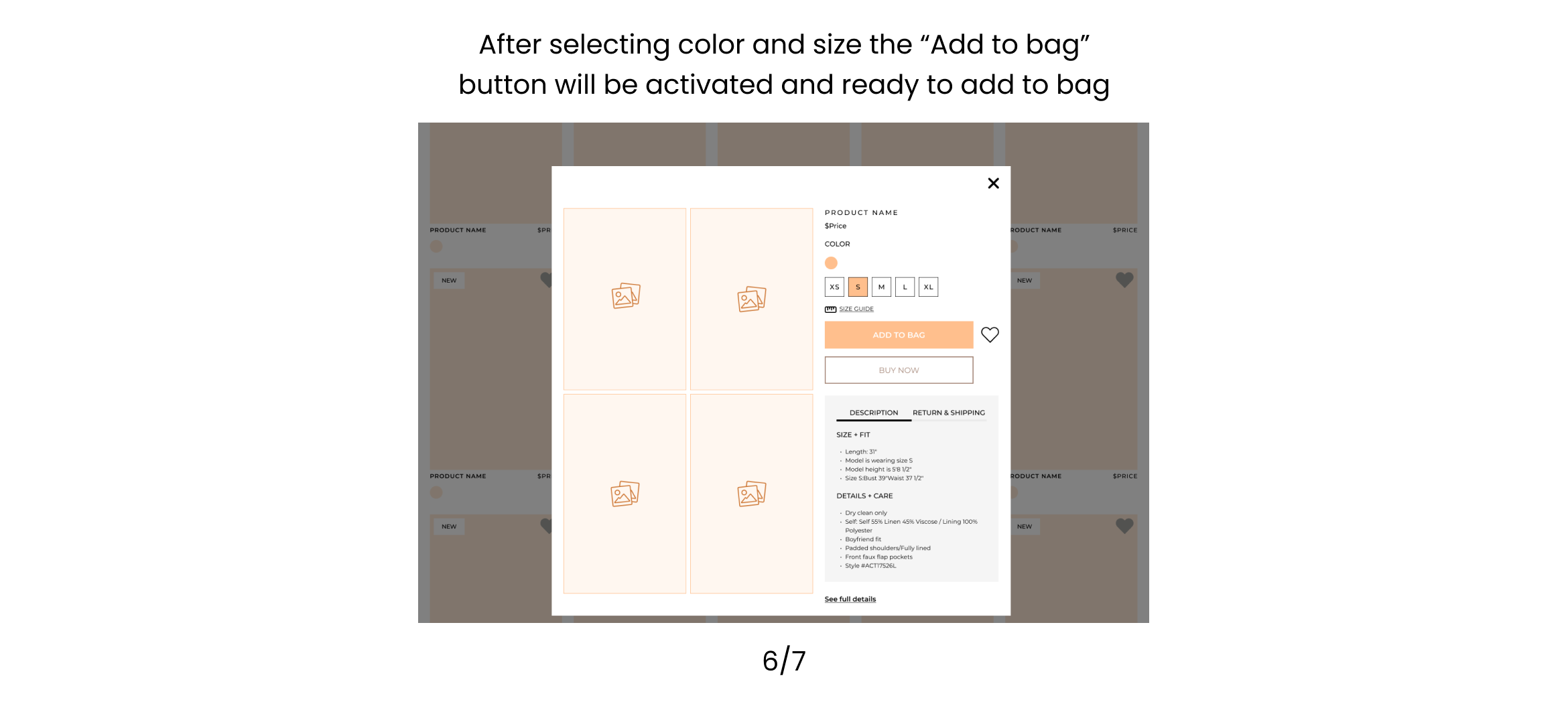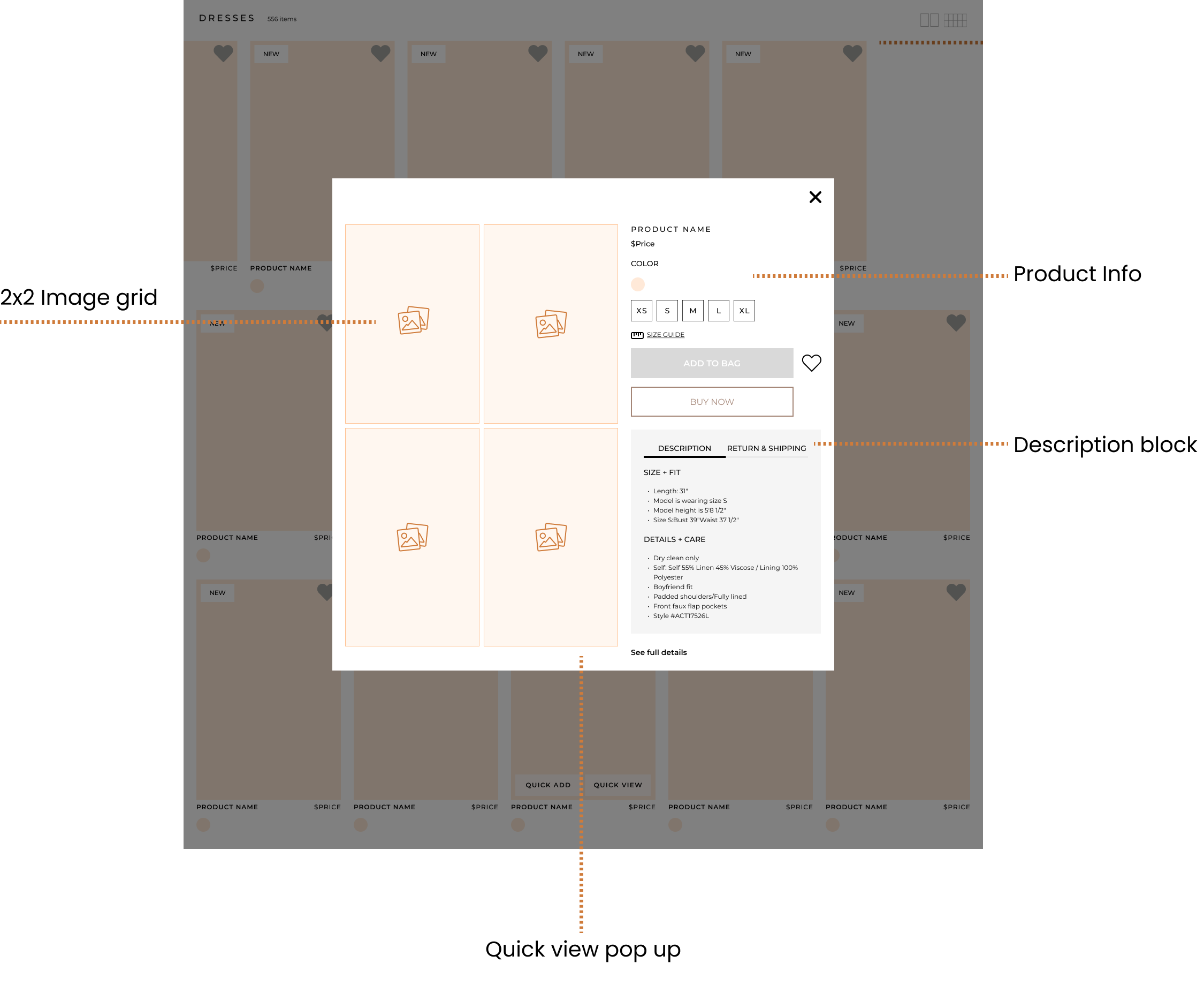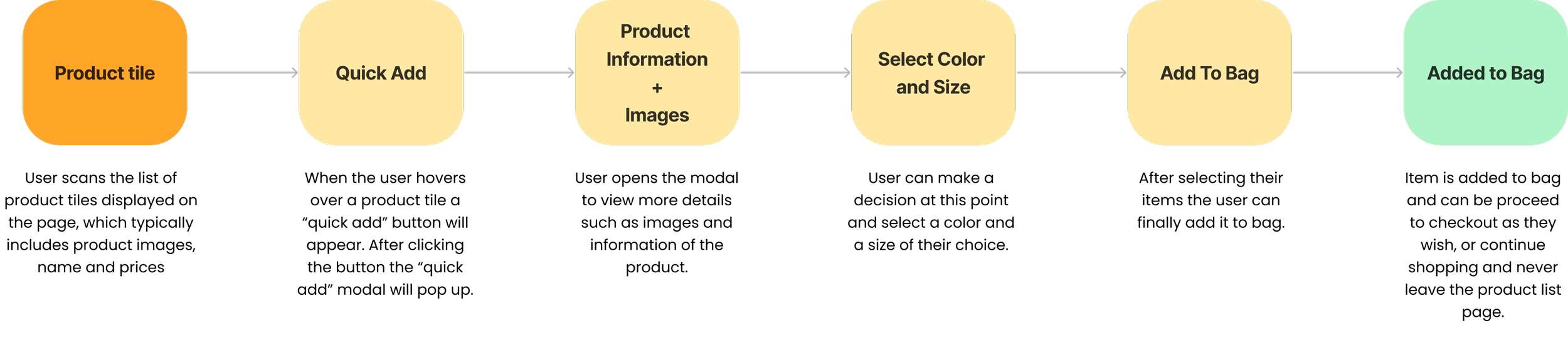→ Add to bag functionality is quick for user to add items in the cart, however they don’t get too much information about the product unless they visit the product page.
