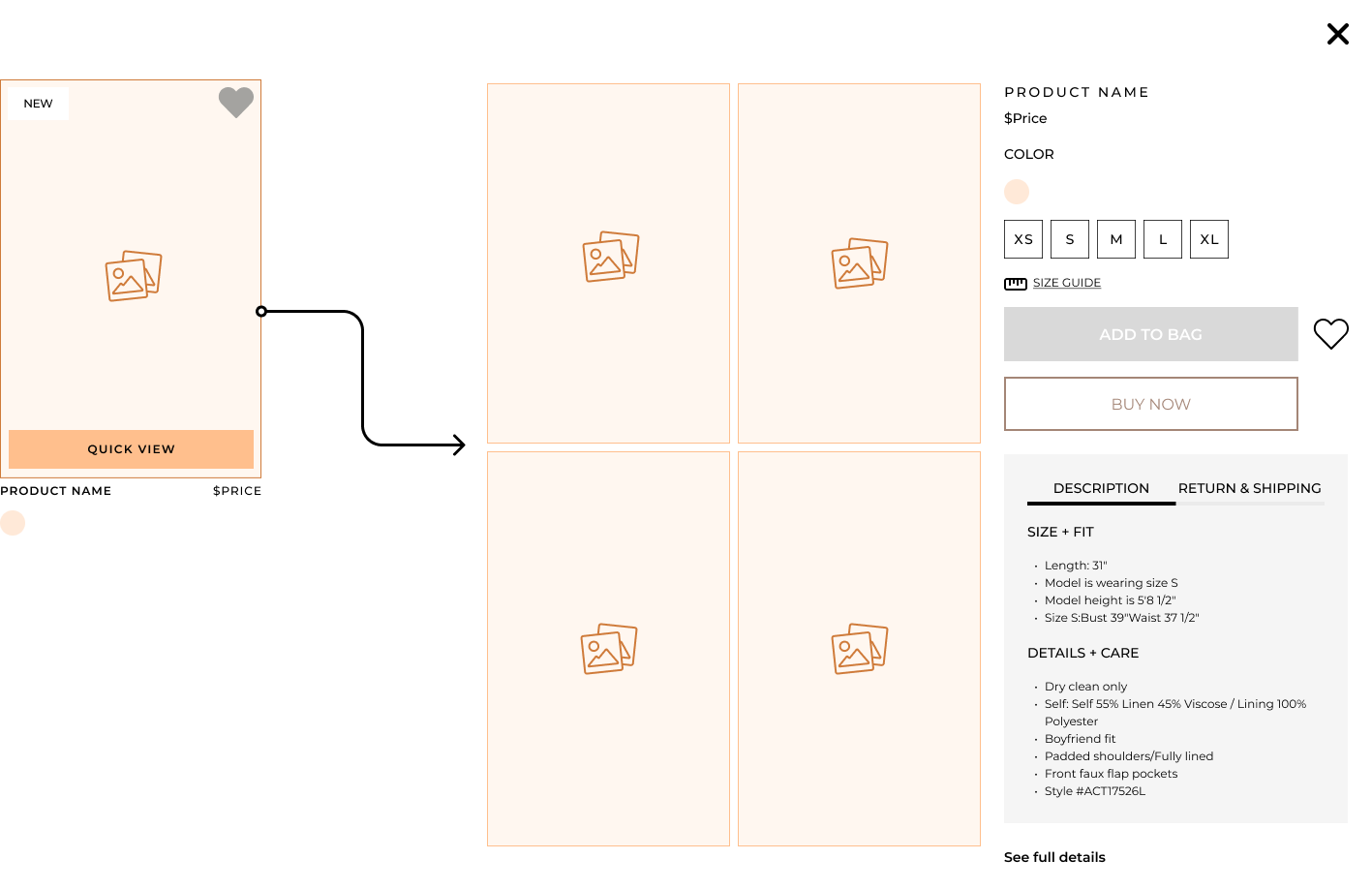 Product tile 2 - Add quick view button and the add to bag button. When clicking the add to bag button all the sizes will appear and the user can select one size to add to cart. Quick view button will open the pop up and then from there the user also can add to cart.